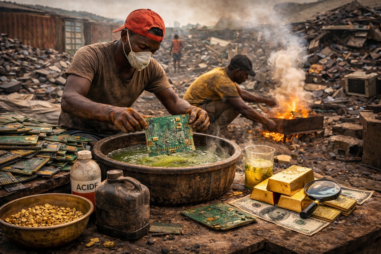 Le recyclage de l’or électronique est économiquement attractif : une tonne de cartes électroniques haut de gamme peut contenir jusqu’à 300 grammes d’or, soit bien davantage que la plupart des minerais naturellement extraits. Cette densité de valeur incite à multiplier les micro-activités informelles, souvent familiales ou communautaires.
